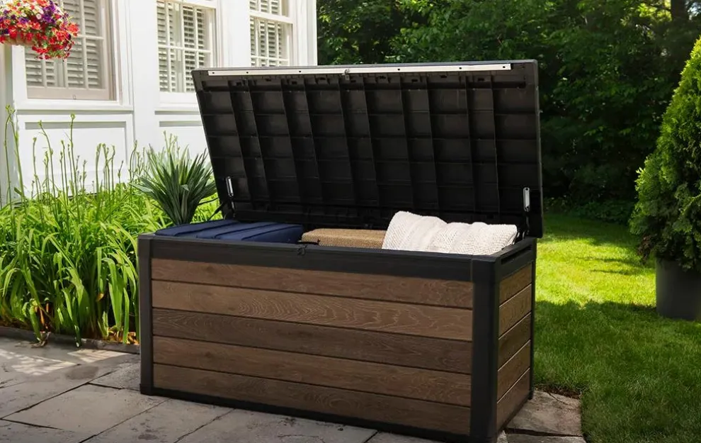 - Wood-look finish: The deck box has a wood-look that doesn’t require all of the maintenance that comes along with wood deck boxes.