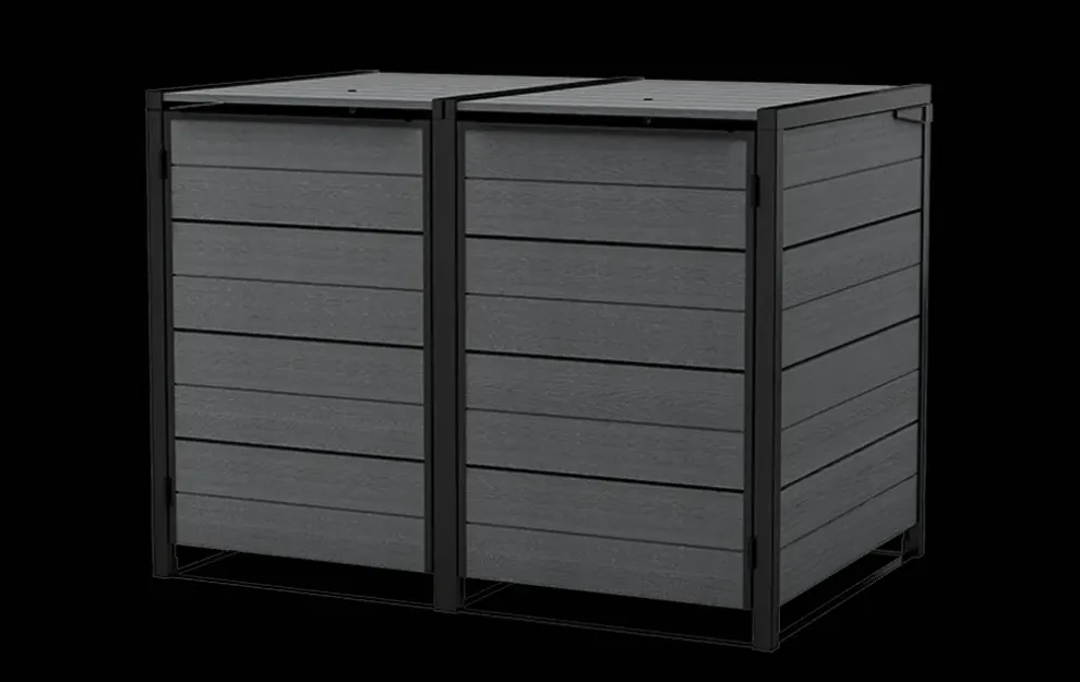 - Flat slope roof: The modern roof of this trash can storage shed opens with ease to allow you access to your bins.