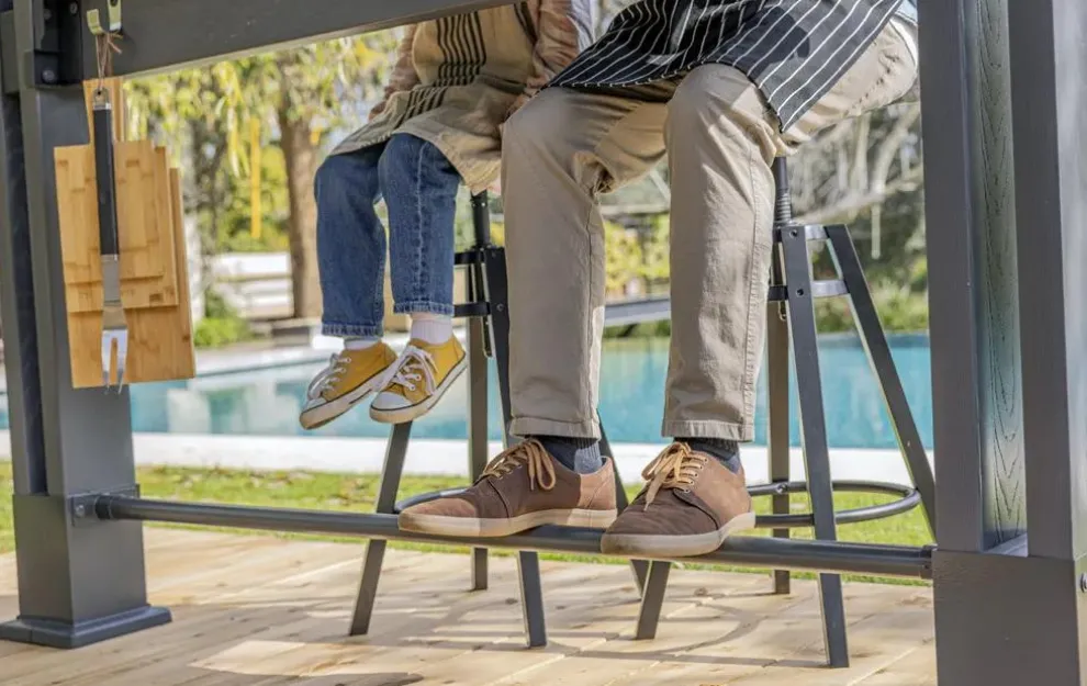 - Heavy-duty construction: Made from a durable weather-resistant resin, this gazebo is reinforced with metal rods and even has grounded metal feet. So, it’s staying put. It can also be fastened to the ground and has 16 anchor points built in. Screws not included.